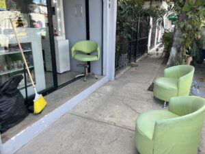 Photo – new hair salon opened from a house three doors down from us. It is the front of the house. The salon chairs don’t fit, so they are out on the sidewalk, and the doors are open so everyone passing by can see right away who is getting their hair done… Only her hairdresser and the entire neighborhood know for sure.